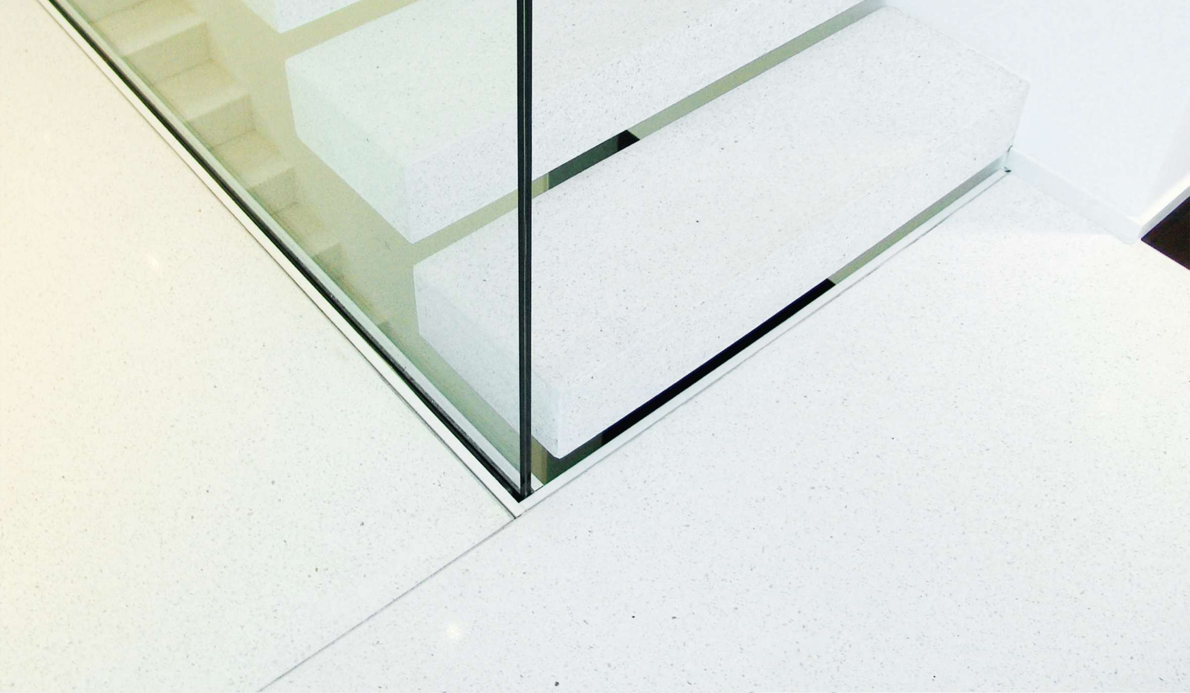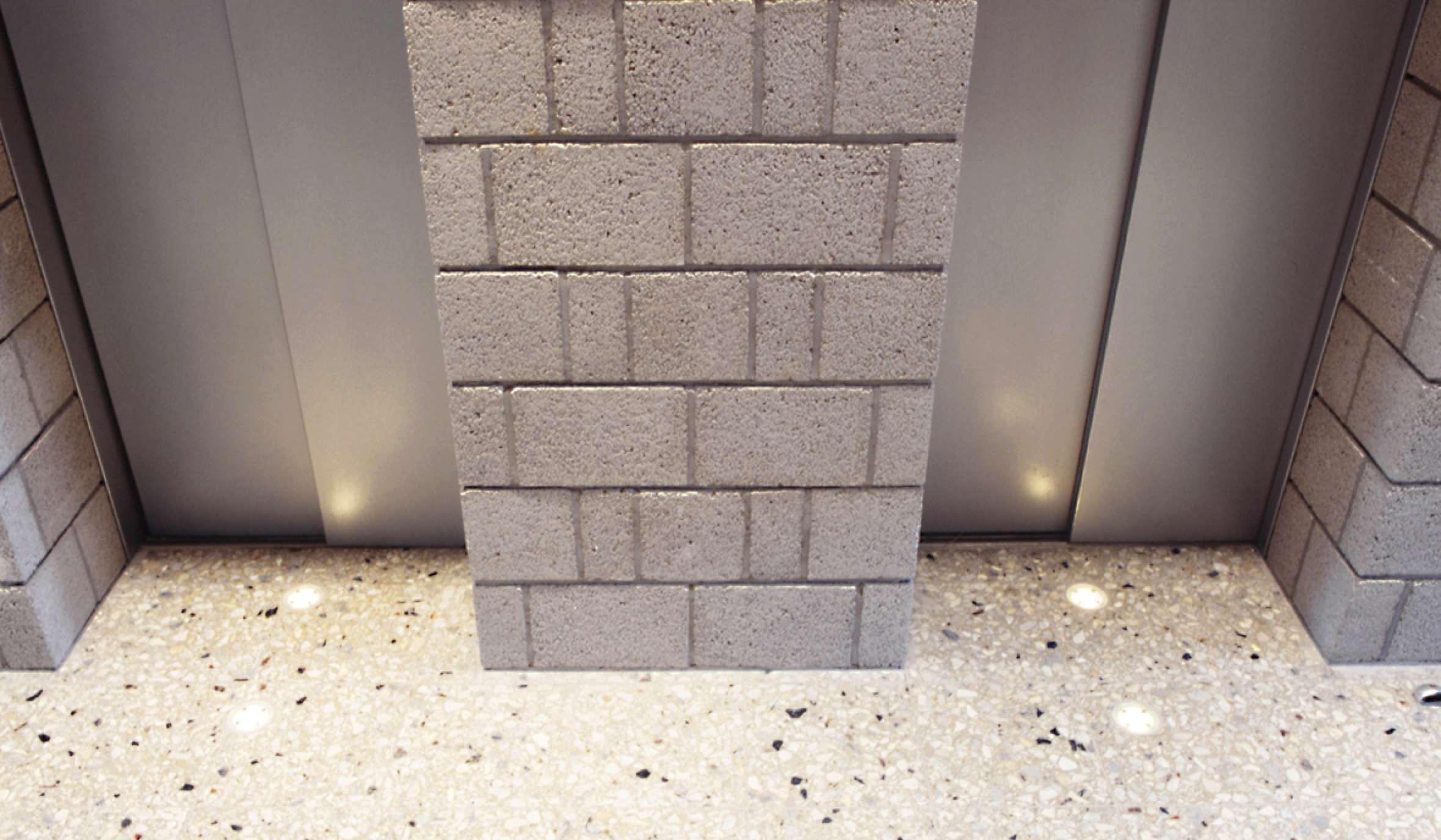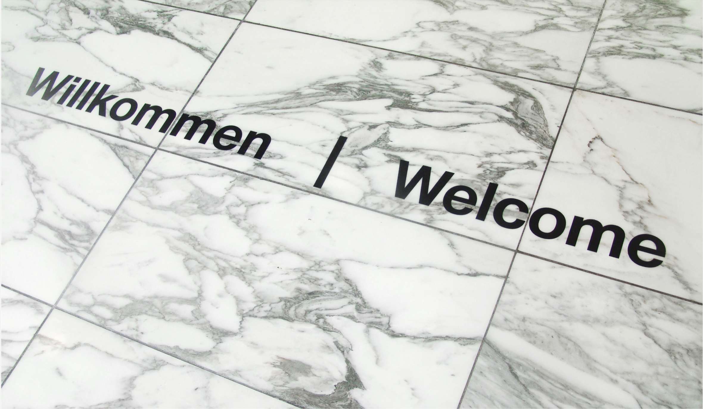 Ein nichtthematisches, neutrales Foyer, dass mit sympathischen Farben, der Hausnummer und eleganten Materialien spielt.