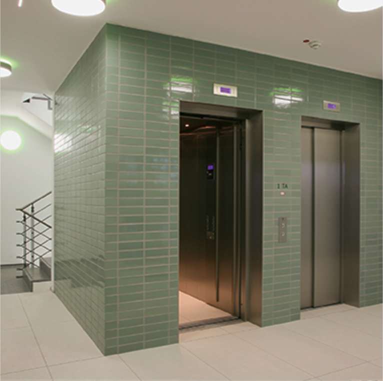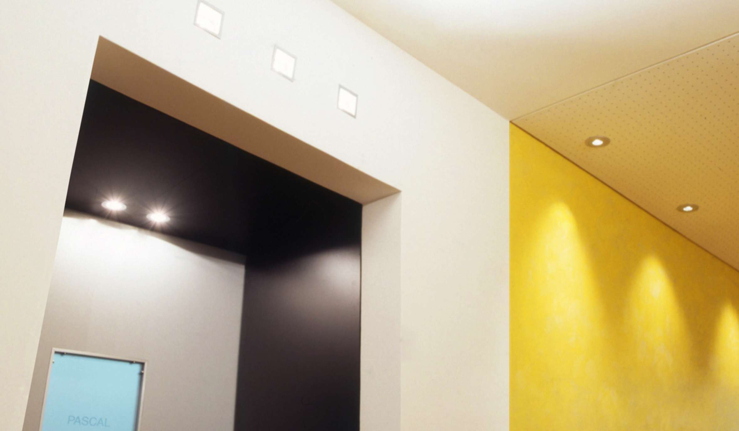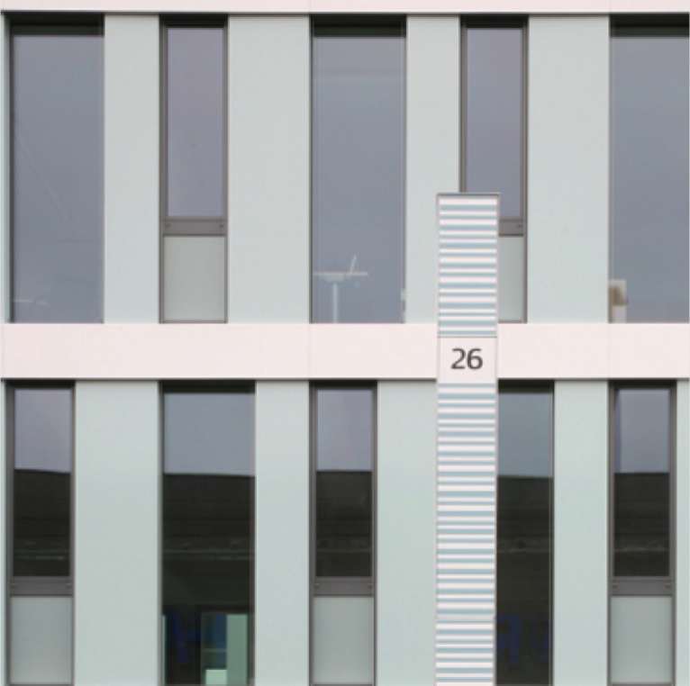 Vernetztes Arbeiten spiegelt sich in den computerbearbeiteten Aststrukturen des Düsseldorfer Fotografen Michael Jaeger wieder. Leuchtende Stelen vor den Auzügen lassen den gesuchten Mieter leicht finden, da die Aufzüge vom Eingang aus nicht erkennbar sind.