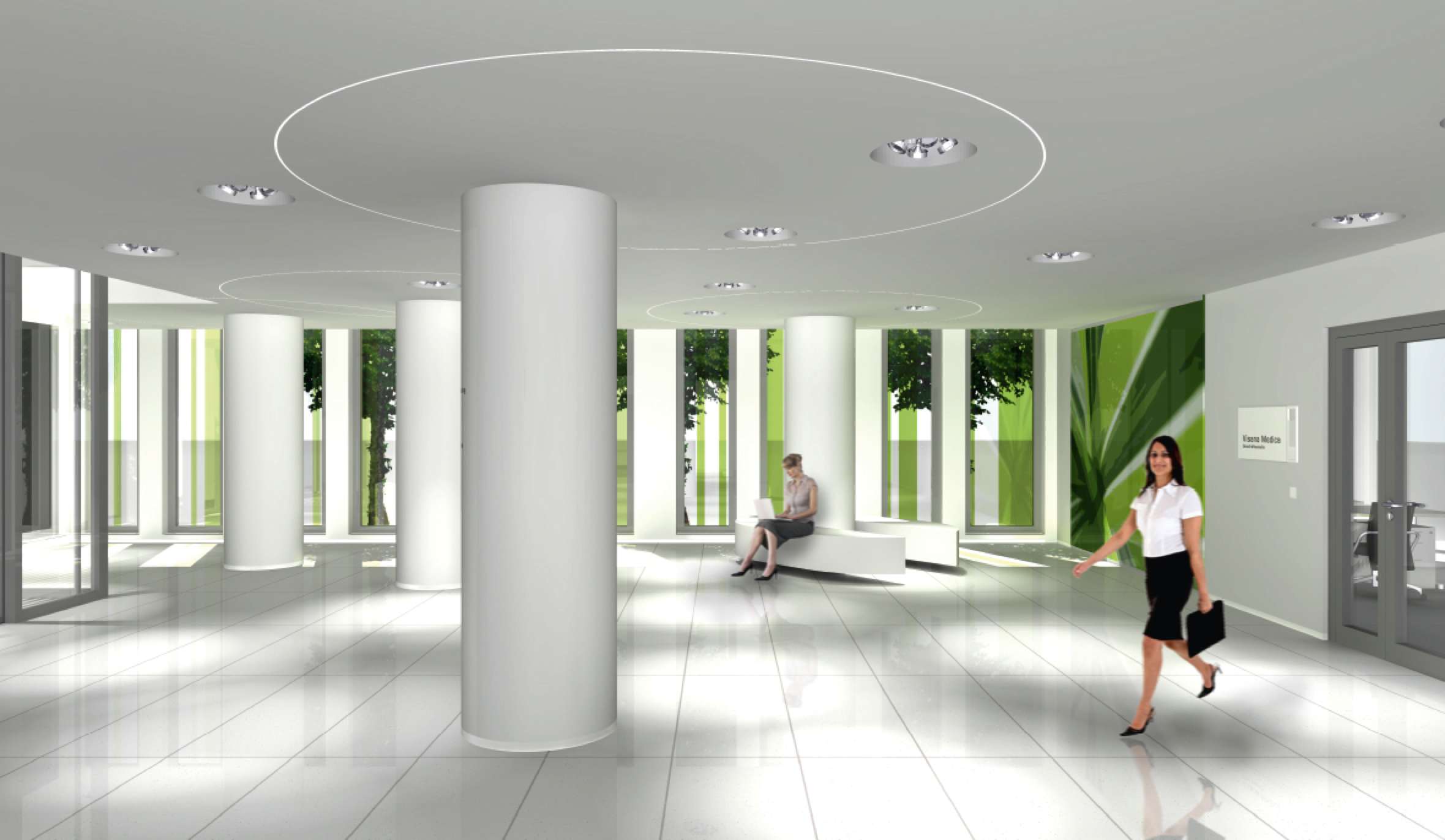 Variante eines zunächst eingeschossig geplanten Foyers. Für einen möglichen Hauptmietinteressenten wurde ein zweigeschossiges Foyer